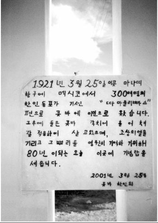 아버지는 3세 때 어머니 손을 잡고 멕시코로 옮겨왔다. 돈을 많이 벌 수 있다는 말에 속아 제물포에서 배에 오른 1031명 중 한 명이었다. 1905년부터 유카탄반도의 에네켄 농장에서 잔뼈가 굵었다. 4년 계약기간이 끝날 무렵 조국은 일제 치하가 됐다. 멕시코에 눌러앉았다. 세계 1차대전이 끝나자 국제 설탕값이 급등했다. 사탕수수밭에서 더 나은 생활을 꿈꾼 한인 288명이 쿠바 동북단 마나티항에 도착한 것은 1921년 3월이었다. 이번에도 더 나은 삶에 대한 희망은 깨졌다. 설탕값이 폭락하면서 일자리가 사라졌기 때문이다. 마나티에는 모기가 들끓고 마실 물도 충분치 않았다. 한인들은 결국 에네켄 농장으로 돌아갔다. 아바나와 인근 마탄사스, 중서부 카르데나스 등지로 흩어졌다. 쿠바인들은 눈이 찢어진 동양인들을 통칭해서 “치노(Chino·중국인)”라고 불렀다. 한인들은 그때마다 “코레아노(Coreano·한국인)”라고 정정케 했다. 마나티에 도착한 지 3달 만에 북미 국민회 쿠바 지방회를 설립했다. 1922년 마탄사스에 민성(民成)학교를, 이듬해 카르데나스에 진성(進成)학교를 세워 한글 교육에 나섰다. 김세원, 박창운, 호근덕, 이승준, 이세창 등 많은 분들이 한인사회 지도자로 활약했다.