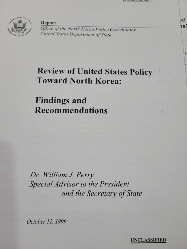 이인영 통일부 장관과 정세현 민주평통 수석부의장은 지난달 18일 페리와 3자 화상 간담회를 가졌다. 통일부가 짤막하게 내놓은 보도자료는 페리의 발언내용을 인용부호 없이 소개했다. ‘북한의 핵 능력 진전 등 당시와 상황은 변했지만, 한반도 비핵화를 위한 외교적 해법은 여전히 유효하다며, 한·미 공동으로 한층 진화된 비핵화-평화 프로세스를 만들어가야 한다고 강조하였다’는 것이다. 고개를 갸우뚱하지 않을 수 없는 내용이었다. 페리는 최근 몇년 동안 일관되게 외교를 통해 북한의 비핵화를 해결할 기회는 이미 놓쳤다는 입장을 유지해왔기 때문이다.