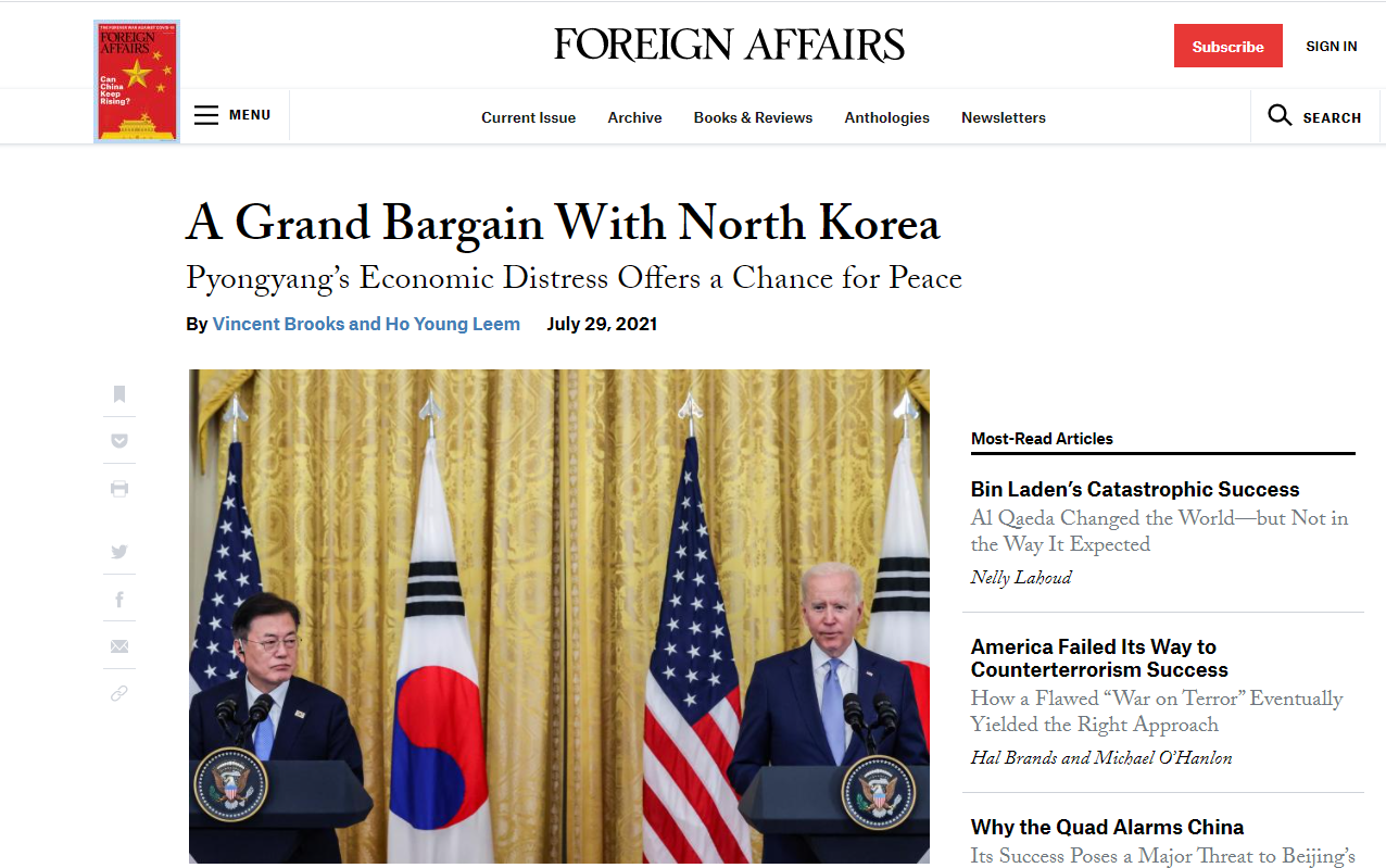 지난 7월29일 미국 포린어페어스에 게재한 빈센트 브룩스 전 한·미연합사 사령관과 임호영 부사령관 명의 공동기고문의 요지다. 글의 제목은 ‘북한과의 대타협(A Grand Bargain With North Korea)’. 한반도 문제를 해결하고 북한의 경제발전 및 동북아 질서의 재편을 도모하자는 전략적 구상이다. 국내에선 원문에 없는 한·미와 북한의 ‘대중 동맹’으로 표현하거나, 군사훈련을 중시한 글의 일부분만을 강조하는 방식으로 선별 소비됐다. 단계적 합의를 통한 긴 호흡의 전략 구상을 ‘일괄타결’이라고 과감하게 오역하기도 했다. 미국 주도 자유주의 국제질서에 속한다고 모두가 동맹의 형태인 건 아니며, 그럴 필요도 없다. 무엇보다 미국이 용납하지 않을 것이다.