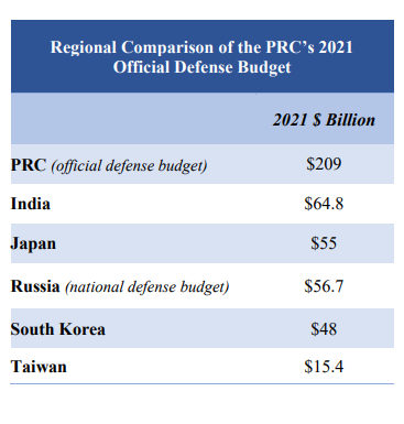 보고서는 대만해협을 둘러싸고 악화일로를 걷고 있는 상황에 우려를 표했다. 인민해방군 해군은 대만 점령을 포함한 훈련을 2020년 13차례에서 2021년 20차례로 늘렸고, 사상 처음으로 상륙작전용 차량(AAV)을 대규모 동원했다. 대만 국방부에 따르면 지난 8월 낸시 펠로시 미 하원의장의 대만 방문에 즈음해 인민해방군 공군은 대만해협 중간선 너머로 250차례 전투기 출격을 감행했다. 또 일본 방위성 자료를 토대로 인민해방군이 8월 한달 동안 대만 주변 해역에 여러 발의 탄도미사일을 발사했고 최소 4발을 대만 영토 위로 날렸다고 설명했다. 인민해방군은 전체 지상군 병력 104만명 중 41만6000명을 대만해협 부근에 배치해놓고 있다. 보고서의 북한 항목은 1쪽에 불과했지만 대만 항목은 9쪽에 걸쳐 기술됐다.