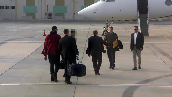 냉전시절 스파이 교환을 연상시킨 미국과 러시아의 '죄수 교환' 현장. 지난 8일 아랍에미리트 아부다비 공항에서 그라이너(맨 왼쪽)와 부트(오른쪽에서 두번째)가 각각 러시아, 미국 호송인과 함께 마주 걸어가고 있다. 두 사람은 각각 다른 방향으로 걸어 자국에서 보내준 비행기에 올랐다. 2022.12.8 UPI연합뉴스