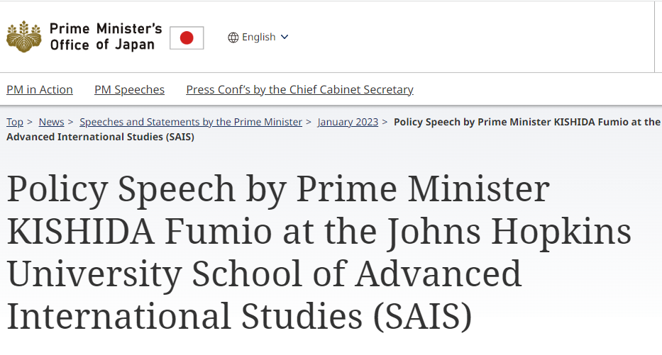 Let me also note the importance of the relationship with India. India is this year's G20 Presidency and a partner with shared fundamental values and strategic interests. India is expected to surpass China’s population and stands as the world's largest democracy. We will further enhance the "Japan-India Special Strategic Global Partnership," forged between our two countries, and continue to work together in pursuit of a FOIP.