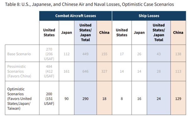 모의전쟁(워게임)의 결과는 대부분 미·일·대만 3국 연합군의 승리로 끝났다. 그러나 중국은 물론, 연합군 역시 막대한 피해를 당하여 이기더라도 이기는 게 아닌, '피로스의 승리'가 될 것으로 예측했다. 24개의 시나리오는 기본/비관적 시나리오(중국 우세)/낙관적 시나리오(중국 열세) 등 3개의 경우의 수로 나뉜다. 미국은 전쟁 초기 중국의 미사일 공격으로 항공모함 2척을 잃는다. 미·일의 전투기 및 전함 손실은 449/646/290대의 전투기와 43/28/24척의 전함을 잃는다. 전쟁기간은 3~4주로 한정했다. 몇 달, 몇 년을 끈다면 피해는 기하급수적으로 늘어날 것이다.