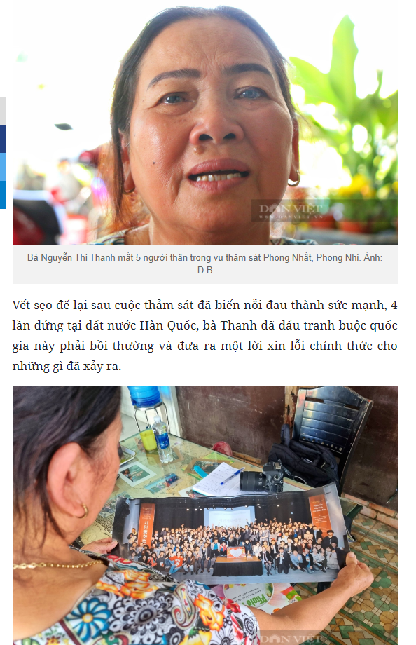 "국내에선 1999년부터 시민사회와 언론, 민간단체 연구자 차원에서 민간인 학살 피해자들의 증언을 토대로 대통령과 정부를 상대로 진상규명 및 사과를 요구해왔다. 일부 대통령들이 유감을 표했지만, 정부는 학살 사실 자체를 인정하지 않아 왔다. 피고 대한민국은 학살 피해자 증언과 각종 자료에도 불구하고 '사건은 한국군이 아닌 베트콩에 의한 것이었을 가능성이 있다' '피해자 증언은 전쟁 당시 한국군 조사 결과와 맞지 않아 신빙성이 낮다'는 등 다양한 논리로 문제를 외면해왔다. 이번 판결은 학살의 실체를 국가 차원에서 인정한 것으로 역사의 한 페이지에 남을 일이었다."