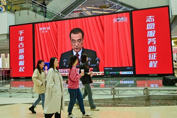중국 산둥성 칭조우 시내에서 5일 행인들이 전인대 실황중계를 하는 대형 스크린 옆을 지나가고 있다. 2023.3.5  AFP 연합뉴스
