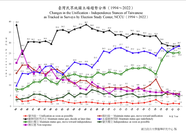 대만의 민심은 압도적으로 현상 유지를 선호한다. 중국도, 미국도 아닌 독립된 공화국으로 민주주의와 시장경제를 유지하고 싶어 하는 것이다. 대만 국립정치대학 선거연구센터의 2022년 조사 결과 '현상 유지'를 원하는 응답이 80% 가까이 나왔다. '조속한 통일'을 원하는 응답은 1.2%에 그쳤고, '현상 유지 뒤 통일'도 6.0%에 불과하다. '조속한 독립'(5.6%)과 '현상 유지 뒤 독립'(25.4%)도 세 사람 중 1명에 불과했다. 가장 높은 응답이 나온 것은 '현상 유지 뒤 추후 결정'(28.7%))과 '영원한 현상 유지'(25.4%)였다.
