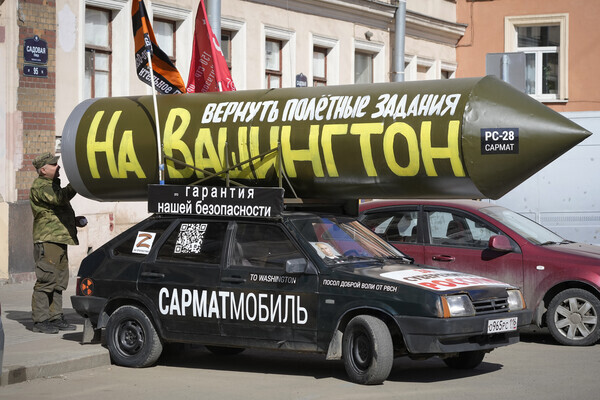 러시아 상트페테르부르크에서 지난 14일 친정부 활동가가 자신의 승용차 지붕에 미사일 모형을 올려놓고 있다. 이 활동가는 '러시아 미사일이 워싱턴을 겨냥하도록 설정하자'는 문구를 써놓고 4개월 예정으로 전국을 돌면서 시위하고 있다.  2023.4.14. AP 연합뉴스