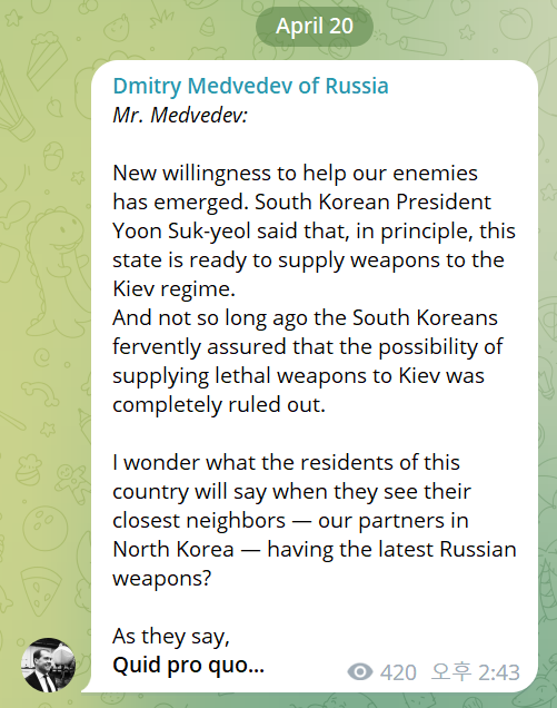 드미트리 메드베데프 러시아 안보회의 부의장(전 대통령)은 20일 텔레그램 계정에 러시아가 상응조치로 북한에 최신 무기를 제공할 수 있음을 시사했다. 메드베데프 부의장은 "자진해서 우리의 적을 도우려는 새로운 움직임이 나타났다"면서 "윤 대통령이 말한 것은 원칙적으로 한국이 우크라이나에 무기를 공급할 준비가 됐다는 말"이라고 평가했다. 이어 "한국인들은 얼마 전까지만 해도 우크라이나에 대한 살상 무기 제공 가능성이 전적으로 배제됐다고 열정적으로 주장했었다"면서 "최신 러시아 무기가 자신들의 가장 가까운 이웃이자 우리의 파트너인 북한의 손에 전달된다면 한국 국민이 뭐라고 말할지 궁금하다"고 덧붙였다. 메드베데프는 '보상' 또는 '대가'를 뜻하는 라틴어(Quid Pro Quo)'로 글을 맺었다.