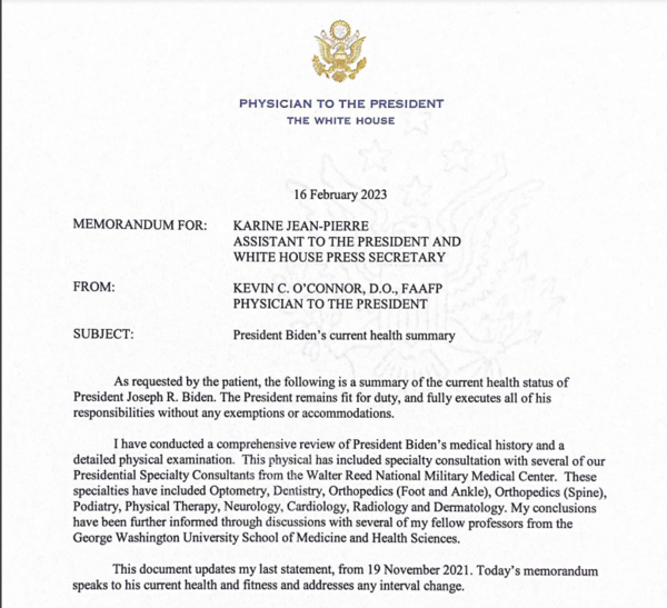 백악관은 지난 2월 16일 대통령 건강 소견서 요약본을 공개했다. 주치의 케빈 오코너는 "바이든 대통령의 '현재' 건강상태는 직무에 적합하며, 어떠한 면제나 편의 제공없이 모든 책임을 완전하게 수행하고 있다"고 진단했다. 취임 첫 해인 2021년 11월에 이어 두 번째 건강 소견서이다. 바이든의 정신적, 신체적 건강은 현재 세계가 직면하고 있는 주요 위기의 하나가 됐다. 내년, 내후년에도 결과를 확인해야 할 사안이다.