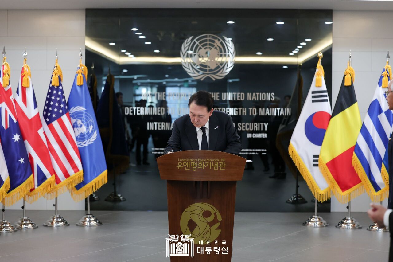 여러분의 고귀한 희생과 헌신을 결코 잊지 않겠습니다. 지금 전 세계 13개국에서 우리 국군 장병 1,000여 명이 해외 파병을 통해 국제사회의 평화 유지 활동에 참여하고 있습니다. 대한민국은 국제사회의 책임있는 일원으로서 자유민주주의 국가들과 연대하고, 한미동맹을 핵심축으로 하여 인도-태평양 지역뿐 아니라 전 세계의 자유, 평화, 번영을 위해 노력할 것입니다. 대한민국 정부와 국민은 지난 70년간 지켜온 자유의 가치가 미래세대에게 이어질 수 있도록 최선을 다할 것입니다. 다시 한번, 유엔 참전국과 참전용사들께 깊은 감사와 무한한 경의를 표합니다. 대한민국은 위대한 영웅들을 영원히 기억하겠습니다. 감사합니다.