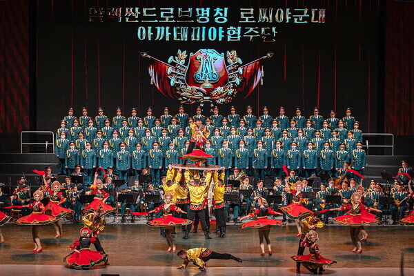 북한의 정권창건 기념일인 9·9절을 축하하기 위해 방문한 러시아 군의 알렉산드로프 앙상블 예술단이 11일 동평양대극장에서 공연을 하고 있다. 2023.9.11. TASS 연합뉴스