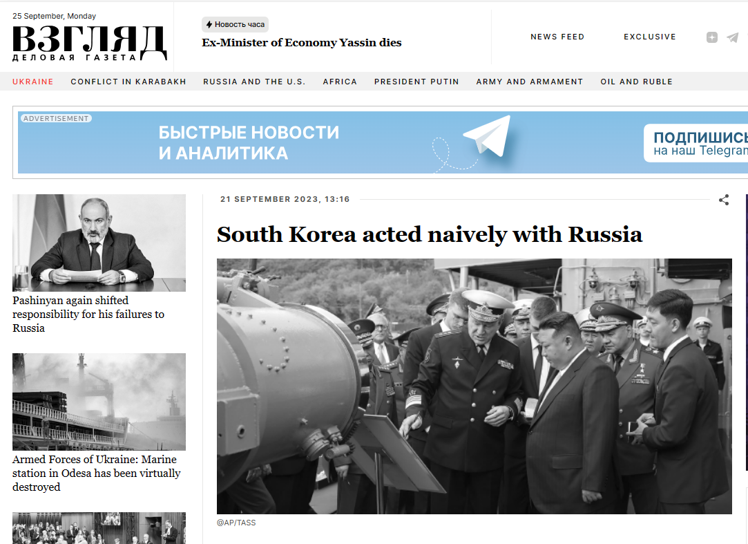 이제 한국은 러시아에 어떤 것도 북한에 넘기지 말라고, 그러면 진짜 위험이 될 것이라고 말하고 있다. 한국은 러시아가 북한과의 가정적인 거래를 결정할 때 순진하게도 자신들의 의견을 고려할 것이라고 상상하고 있다. 하지만 러시아는 그렇게 하지 않을 것이다.