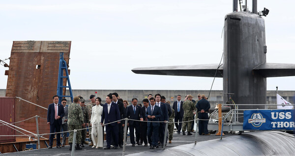 윤석열&nbsp;대통령과 부인 김건희 여사가 19일 부산 남구 해군작전사령부 부산작전기지에 입항한 미국의 오하이오급 핵추진 탄도유도탄 잠수함(SSBN) 켄터키함(SSBN-737)에 승함하고 있다. 2023.7.19 [대통령실통신사진기자단] 연합뉴스