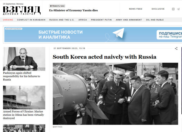 한·러 관계는 우크라이나 전쟁을 전후해 30여 년 '친선 관계'에서 '비우호 관계'로 바뀌었다. 이제 '적대적 무시 관계'로 가는 양상이다. 크렘린궁과 러시아 외교부의 정제된 외교적 표현과 달리 러시아 언론은 더 선명하게 그 길을 제시한다. 서두에 소개한 '브즈그랴드(시각)'는 러시아에서 상당한 공신력을 인정받는 인터넷 신문이다. 비영리기구 '사회문제 전문가 연구원(EISI)'이 발행한다. 브즈그랴드의 드미트리 바븨린은 21일 '한국은 러시아에 대해 순진하게 행동했다'라는 제목의 논평에서 러시아의 '다음 행보'를 가늠할 단서를 제공한다.  ☞ 한글 번역본