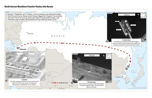북한은 지난 8월 초부터 선박과 수송기 편으로 러시아에 10여 차례 포탄 등을 수송한 것으로 파악된다. 나진항에서 러시아 극동 연해주 두나이, 보스토치니 항으로 옮겨진 뒤 열차에 적재돼 우크라이나 접경 티오레츠크 탄약고에 도착했다. 포탄은 약 100만 발이다. 러시아군이 우크라이나 전쟁에서 2달가량 사용할 수 있는 분량이다. 북한은 수요량을 맞추기 위해 군수공장을 전면 가동하고 있고, 주민까지 동원해 탄약상자를 운반하고 있다. 군 관계자는 2일 나진항에서 러시아로 건너간 컨테이너 수를 2000개로 추산하고 152㎜ 포탄이라면 100만 발 이상, 122㎜ 방사포탄이라면 20만 발 이상이라고 추정했다. 컨테이너의 부피를 토대로 계산한 거로 보인다. 군 관계자는 "최근에는 단거리탄도미사일(SRBM) 지원 정황도 신뢰할 수 있는 '첩보'를 통해 확인했다"고도 전했다. (연합뉴스)