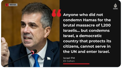앞서 이스라엘 외교부는 6일 린 해스팅 유엔 인도주의 조정관의 입국비자를 취소했다. 코헨은 이날도 엑스 계정에 "1200명의 이스라엘인을 잔인하게 학살한 하마스를 규탄하지 않고, 국민을 보호하는 민주국가인 이스라엘을 비난하는 사람은 유엔에 근무할 수 없으며, 이스라엘에 입국할 수 없다"는 메시지를 날렸다. 해스팅은 유엔이 임명한 점령당한 팔레스타인 영토 담당 조정관으로 현지에 상주해왔다. 이스라엘군의 공격 이후에는 가자주민 110만 명을 보호하고 있는 유엔팔레스타인난민구호기구(UNRWA) 업무를 감독하고 있다.