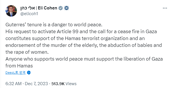 "구테흐스(유엔 사무총장)의 재임이 세계 평화에 위험이다. 그가 가자지구 휴전을 위해 유엔헌장 99조를 발동한 것은 하마스 테러리스트 조직에 대한 지지인 동시에 노인 살해와 아기 납치 및 여성 강간을 승인하는 것이다. 누구든 세계 평화를 지지하는 사람들은 가자지구를 하마스로부터 해방하는 것을 지지해야 한다."