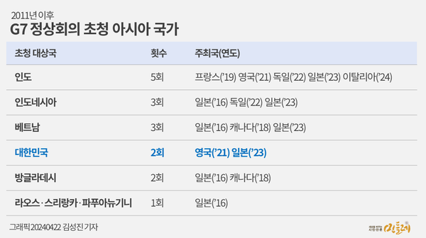 2019년 이후 단골로 참가한 아시아 국가는 인도다. 이번 이탈리아 회의까지 5번 초청됐다. 인도네시아와 베트남이 각 3회 초청됐다. 한국은 방글라데시와 함께 2회 초청국이다. G7 회의 참가 횟수가 글로벌 지위의 잣대라면 한국은 인도-인도네시아-베트남에 뒤지고, 방글라데시와 동률이 된다. 객관적인 지표에서 이미 선진국이 된 대한민국 국민에게 이를 어떻게 설명할 것인가. GPS니, 플러스 국가니 하면서 G7이나 북대서양조약기구(나토) 정상회의 참석을 외교 치적으로 강조하는 정부가 시대착오적이다.