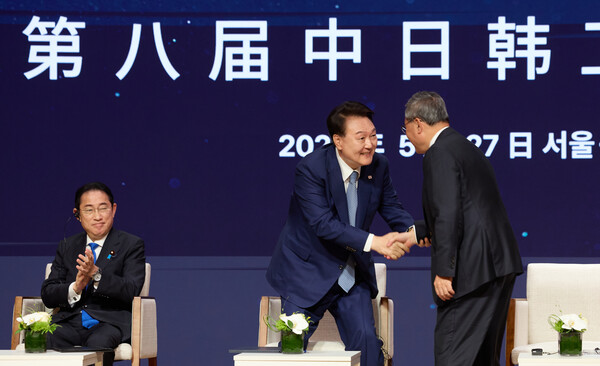 27일 제9차 한일중 정상회의 뒤 공동기자회견에서 각국 정상이 공동기자회견에서 최우선으로 내세운 회의 성과였다. 의장국인 한국이 내놓은 '의제'가 무엇인지는 감지하기 어려웠다. 한·일 한 팀과 중국의 대화를 방불케 했다. 대한민국 처지에서 가장 중요한 한반도 안보 환경에 대해서는 어떠한 공감대도 없었다. 달리 말하면 한국이 의제 설정에 실패했다는 말이다.
