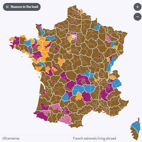 각종 여론조사에 따르면 RN은 오는 7일 결선투표에서 240~270석을 얻을 것으로 전망된다. 7석(2017)→89석(2022)에 이은 눈부신 성장이다. 이제 관심은 RN이 과반의석(289석)을 넘길지다. 1차 투표 1위 정당을 색으로 표시한 지도는 프랑스를 온통 RN의 밤색으로 물들였다. 2022년 총선에서 249석을 얻었던 앙상블의 패배는 디폴트다. NFP는 기존 149석에서 약간 늘어날 것으로 예상되는 수준.