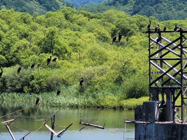 사람 손길이 닿지 않아 수많은 물고기가 서식하고, 하루 700g의 물고기를 먹어 치우는 가마우지 떼가 부러진 다리 난간에서 한가로이 털을 말리고 있었다. 물가는 물론 탐방로에까지 자라가 기어 나온다. 뱀이 많이 출몰하는 지역이지만 다행히 탐방길에 마주치지 않았다. 먹이사슬의 정점은 독수리만 한 덩치의 민물가마우지. 왕성한 먹성 탓에 유해조수이지만, 이곳은 가장 풍요롭고 안전한 서식지다. 기후변화 탓도 있지만 겨울 철새였던 가마우지가 눌러앉아 텃새가 된 연유다.