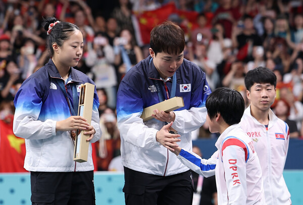 30일 파리 사우스 아레나4에서 열린 탁구 혼합복식 시상식에서 반전이 있었다. 남북 경기는 성사되지 않았지만, 은메달을 차지한 북측 김금영-리정식과 동메달의 남측 신유빈-임종훈의 시상대 만남이 이뤄졌다. 경향신문 현장 보도에 따르면 사회자의 '북한(North Korea)' 호칭을 북측 임원이 나서 'DPR Korea'로 정정했지만, 날 선 분위기는 아니었다고 한다. 무엇보다 김금영-리정식은 임종훈의 휴대폰 셀피 속에서도 전혀 어색하지 않았다. 리정식은 덤덤한 표정이었고, 김금영은 활짝 웃었다. 항저우 시상식에서 보였던 무표정에서 벗어난 것이다. "경기도 박진감이 있었지만, 시상대 셀피는 파리 올림픽의 더 기억할 순간의 하나였다"고 전한 UPI 통신의 관점이 와 닿았다. '남·북 청년들 하나 둘 셋, 김치.' 1일 자 경향신문의 관련기사 제목도 눈에 띄었다.