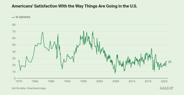 2001년 1월, 긍정 답변 56%로 출범한 조지 W. 부시의 임기 8년 동안, 국민적 사기는 추락 일변도였다. 9·11 테러가 일어난 달 43%로 내려갔다가 아프가니스탄 침공 초기(2001. 12.) 70%를 기록했다. 아프가니스탄과 이라크에서 두 개의 전쟁을 수행하는 동안 국가의 방향을 긍정적으로 본 국민은 갈수록 줄었다. 많은 국민을 제3세계 국민으로 전락시킨 2005년 8월 허리케인 카트리나(2005.8.)에 대한 부실 대응도 사기 저하를 부채질했다. 국정연설에서 이란·이라크·북한을 '악의 축'으로 지목한 2002년 1월 65%로 기세를 올렸지만, 이후 임기 말까지 내림세를 벗어나지 못했다.