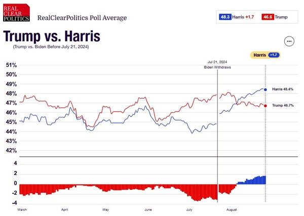 트럼프 피격은 오차 범위 내였지만 트럼프에 만성적으로 뒤졌던 바이든의 패색을 더 짙게 했다. 트럼프의 기적적인 생환과 피 흘리는 사진이 보도되면서 당선은 따 놓은 당상이란 인식이 확산됐다. 공화당 전당대회(7.15~18)의 컨벤션 효과가 겹치면서 트럼프는 여론조사 지지율에서 바이든과의 격차를 3%P 이상으로 벌렸다. 분위기를 다시 바꾼 건 같은 달 21일, 바이든의 전격 후보 사퇴였다. 장군에 멍군 격이었다. 해리스는 별다른 메시지도, 특징도 없는 유세를 벌였음에도 주류 언론의 지원사격 덕에 지지율이 올라가기 시작했다. 민주당 전당대회(8.18~22)의 컨벤션 효과도 상승효과를 도왔다.