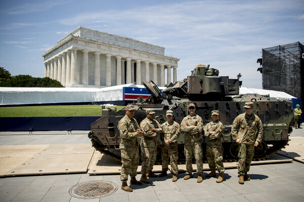 군사행진을 유독 좋아했던 '군 미필 대통령'은 미국에도 있었다. 오는 11월 대선에 다시 출마한 도널드 트럼프 전 대통령이다. 트럼프는 2018년 11월 11일 재향군인의 날, 워싱턴에서 대대적인 퍼레이드를 계획했다. 1991년 걸프전 승리 기념 군사행진 이후 처음이기에 반발이 상당했다. 트럼프는 미국 5대군(육군, 해군, 공군, 해병대, 해안경비대) 부대와 각종 군사장비를 총동원할 작정이었다. "지금이 어느 시대냐" "북한식 행렬을 하자는 건가"라는 비난이 쏟아졌지만, 아랑곳하지 않았다. 그런 트럼프도 최소 5000만 달러(약 660억 원)의 예산이 필요하다는 지적에 행사를 전격 취소했다. 이듬해 독립기념일(7.4.) 기념행사에 군사 행진을 얹었다.