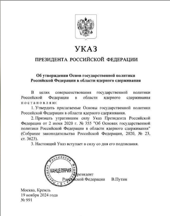 Vladimir Putin signed Executive Order Approving the Basic Principles of State Policy of the Russian Federation on Nuclear Deterrence. November 19, 2024, 11:10