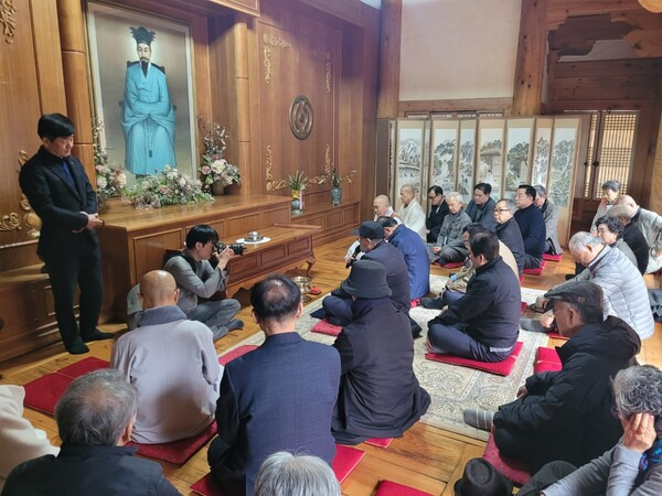 "이곳이 수운 대신사께서 1980년 경신년 4월 5일 최초로 종교체험을 하시고 한울님으로부터 무극대도를 받은 곳입니다. 우리가 용담정을 답사하는 이유는 대신사님의 가르침을 어떻게 하면 직접 체험하고 실천할 것인지, 그 신념을 다지기 위해서라고 생각합니다."