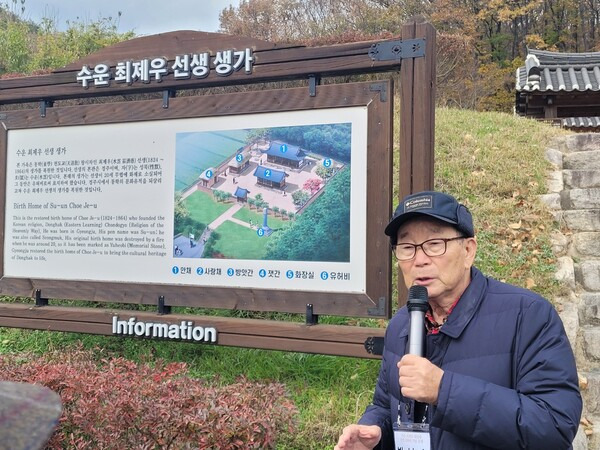 "이곳이 수운 대신사께서 1980년 경신년 4월 5일 최초로 종교체험을 하시고 한울님으로부터 무극대도를 받은 곳입니다. 우리가 용담정을 답사하는 이유는 대신사님의 가르침을 어떻게 하면 직접 체험하고 실천할 것인지, 그 신념을 다지기 위해서라고 생각합니다."