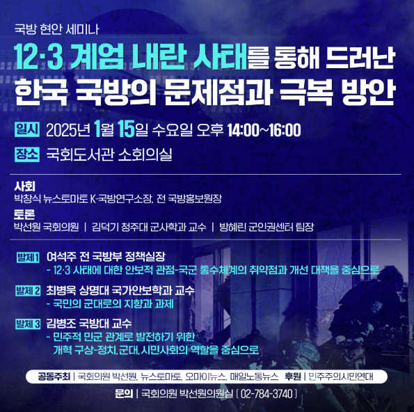 첫 번째 발제를 맡은 전 국방부 정책실장 여석주입니다. 제가 말씀드릴 주제는 12.3사태에 대한 안보적 관점으로 국군 통수체계의 취약점과 개선 대책을 중심으로 살펴보고자 합니다. 오늘 이 자리에 참석하신 여러분과 우리 국민 대부분이 그렇듯이 저 또한 지난 12월 3일의 밤을 분노, 비통, 흥분으로 지새웠습니다. 헌법 준수를 선서했던 대통령의 헌법 파괴와 국민 보호를 맹세했던 장군들의 국민 위협에 분노했습니다. 국군의 최정예 부대가 불법적 명령에 동원되고 허둥거리다 못해 조리돌림을 당하는 모습에 비통했습니다. 그럼에도 불구하고 죽을 각오로 국회의 담을 넘고 서로 어깨를 걸고 저항하며 기어코 계엄해제 의결의 의사봉을 세 번 두드리는 국회의 용기에 흥분했습니다. 군복을 입었던 개인으로서 국회의원 및 직원 여러분께 사과와 감사의 말씀을 드립니다. 12월 3일 밤의 분노, 비통, 흥분이 가시지 않다 보니 행여 발제 중에 감정이 격해질까 두려워 원고대로 읽기만 하는 점을 양해해 주시기를 바랍니다.