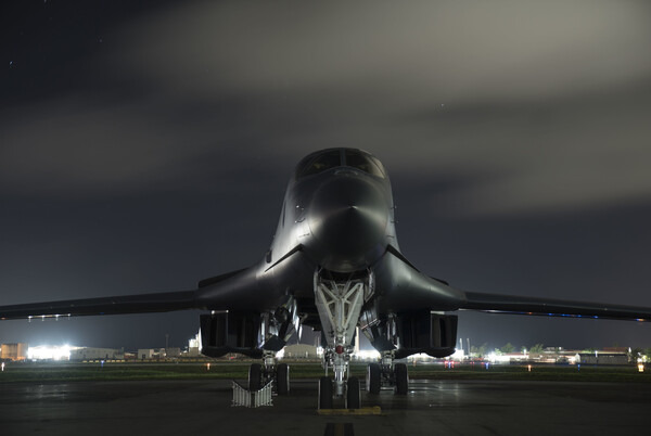 북한의 첫 대륙간탄도미사일(ICBM) 시험 발사 뒤인 2017년 7월 20일 '죽음의 백조'로 불리는 미 공군 전략폭격기 B-1B가  괌의 앤더슨 기지에서 출격을 준비하고 있다. 도널드 트럼프 미국 대통령이 북한의 완전한 절멸을 경고하고, 북한이 괌 포위사격으로 맞선 2017년 8월 14일, 제임스 매티스 미 국방장관은 "북한이 미국을 향해 미사일을 발사하면 그것은 전쟁"이라고 말했다. AP 연합뉴스