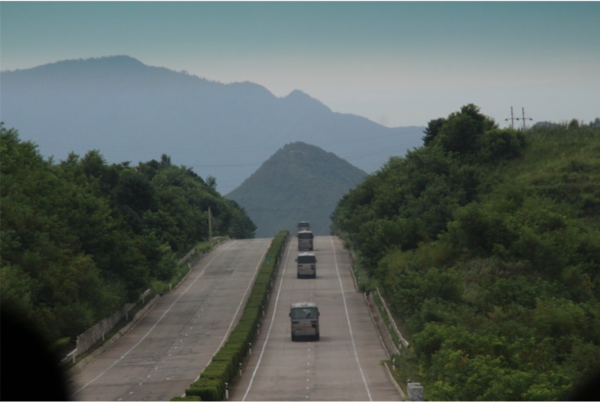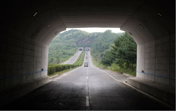 평양으로 가는 길. 2018년 8월 평양에서 열린 아리스포츠컵 국제 유소년 축구대회를 치르기 위해 개성~평양 고속도로를 달려가는 차량 행렬. 김진호 에디터