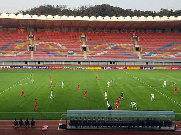 2019년 10월15일 평양 김일성경기장에서 카타르 월드컵 아시아 지역예선 H조 경기를 치르고 있는 남북한 국가대표팀. 관중석이 텅 비었다. [대한축구협회 제공] 시민언론 민들레