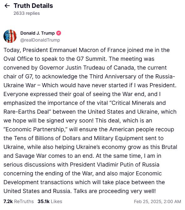 우크라이나 전쟁 개전 3주년의 초점이 엉뚱하게 도널드 트럼프 대통령이 띄운 '희토류 5000억 달러'에 집중되고 있다. 트럼프 대통령은 지난 24일 X계정(트루스 소셜)에 "미국-우크라 간 희토류 타협안이 곧 체결되기를 희망한다"고 적었다. 트럼프는 이날 백악관 집무실에서 방미 중인 에마뉘엘 마크롱 프랑스 대통령과 함께 우크라전 개전 3년을 맞아 열린 주요 7개국(G7) 화상 정상회의에서 이같이 말했다고 소개했다.