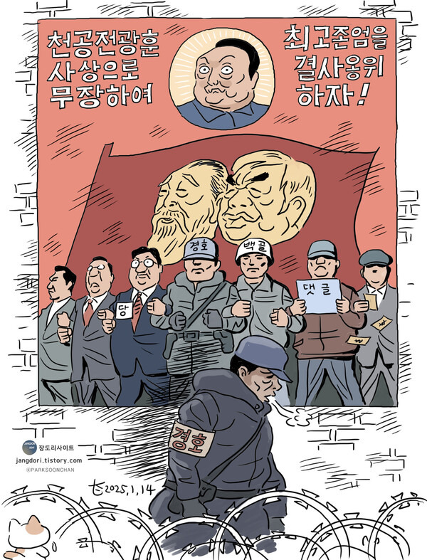 벌어질 일을 이미 예상했던 걸까. 다음 네 컷의 만화에서 내란수괴는 나뭇가지에 앉아 까마귀들이 물어오는 안줏거리를 구워 먹으며 호기 있게 술잔을 들고 있다. "반격의 시간이 다가오고 있다"는 그의 선언에 똘마니들(한덕수, 권성동)이 경례하면서 "멸공"을 외친다.