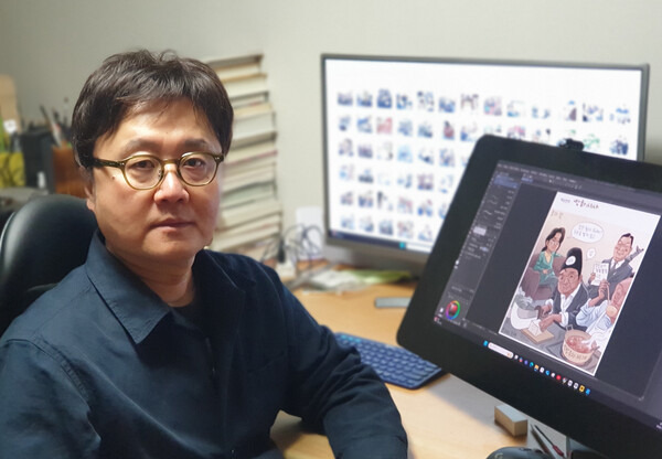 시사만화가 박순찬은 흔들리는 시대의 표정을 기록한다. 대통령 윤석열의 12.3 비상계엄이 선포 이후 헌정 위기 기간이 길어지면서 그의 붓 터치에 갈수록 힘이 실린다. 박순찬은 그러나 큰 목소리로 말하지 않는다. 현실의 긍정과 부정 가운데 하나를 골라 당위로 강요하지도 않는다. 조용히 눌러앉아 관찰하고 그 결과를 화폭에 꾹꾹 담아낼 뿐이다. 한 컷, 한 컷이 모여 시대의 단막극이 되고, 다시 책으로 묶여서 연대기가 된다.