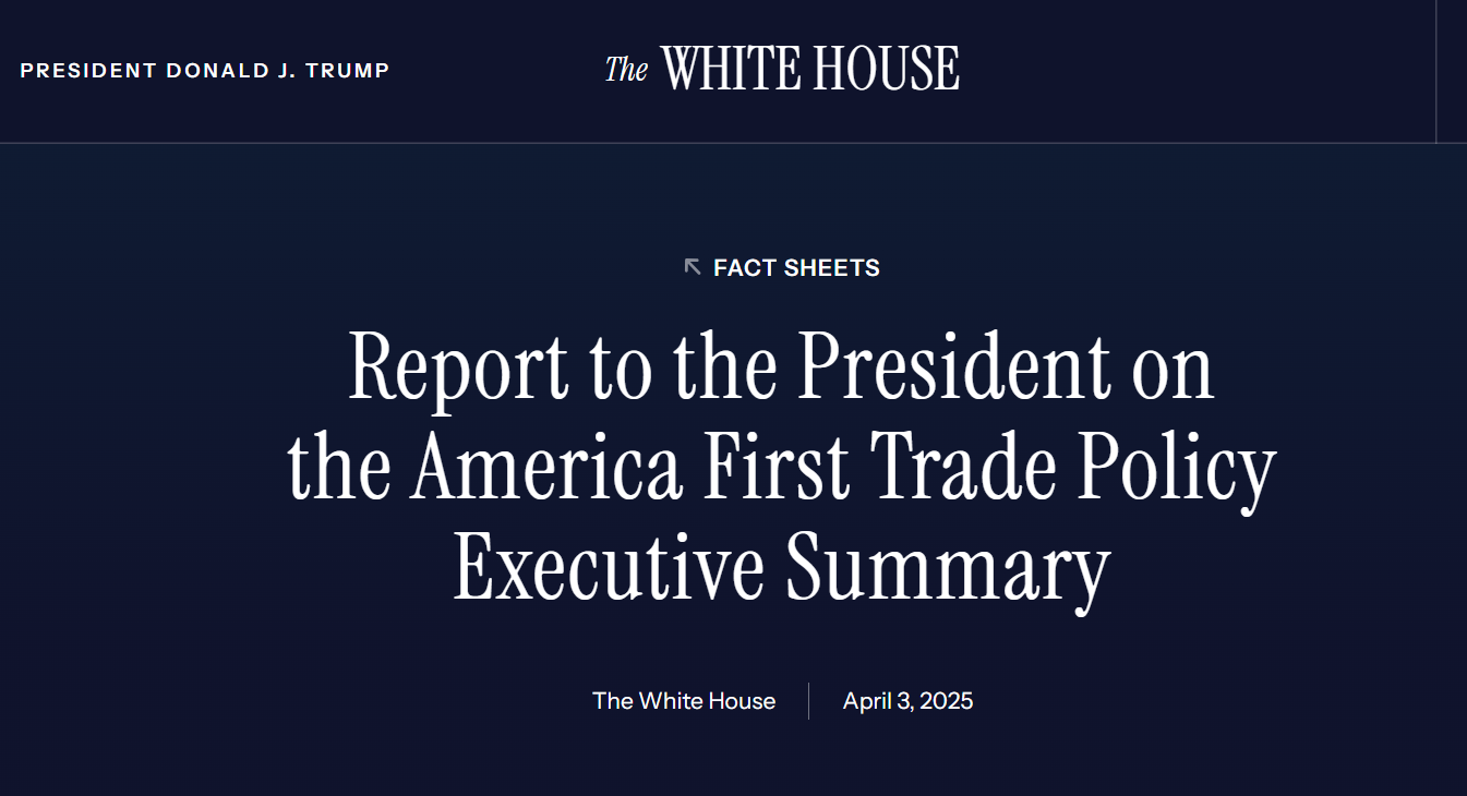 Pursuant to the January 20, 2025 Presidential Memorandum on America First Trade Policy (AFTP), directed to the Secretary of State, Secretary of the Treasury, Secretary of Defense, Secretary of Commerce, Secretary of Homeland Security, Director of the Office of Management and Budget, U.S. Trade Representative, Assistant to the President for Economic Policy, and the Senior Counselor for Trade and Manufacturing, the President instructed the Department of the Treasury, the Department of Commerce, and the United States Trade Representative to report to the President on April 1, 2025, on the topics set forth therein, consisting of 24 individual chapters containing the reviews, investigations, findings, identifications, and recommendations enumerated in Sections 2(a) through 4(g) of the Presidential Memorandum. The Report also includes the expanded scope of work on non-reciprocal trading practices directed by the February 13, 2025 Presidential Memorandum on Reciprocal Trade and Tariffs. The findings from Sections 3(c), 3(d), and 3(f) of the February 21, 2025 Presidential Memorandum on Defending American Companies and Innovators from Overseas Extortion and Unfair Fines and Penalties are incorporated therein. This unified report is delivered to the President accordingly.