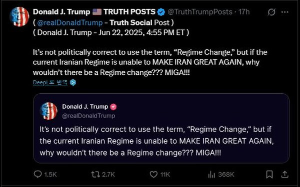 "정권교체라는 말을 사용하는 건 정치적으로 옳지 않다. 그러나 만약 현 이란 정권이 '이란을 다시 위대하게(MIGA)' 하지 못한다면 정권교체가 일어나지 않겠나?" (22일, X 계정)
