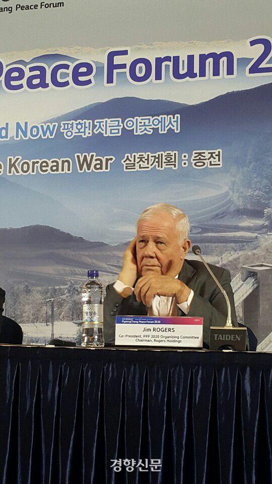 9일 개막한 2020 평창평화포럼에 주요 연사로 참석한 국제적인 투자전문가 짐 로저스(77)는 이날 강원 평창 알펜시아 컨벤션 센터에서 열린 기자회견에서 이같이 말했다. 로저스는 특히 “남과 북의 젊은이들이 스포츠를 한다면 서로를 죽이기 위해 하는 게 아닐 것”이라면서 “남과 북이 엄청난 국방비를 줄이고, 그 돈으로 38선 근처에서 (남과 북의 젊은이들이)K-pop 공연이나 예술 공연을 하면 얼마나 좋겠는가. 그런 일이 반드시 일어나야 한다”고 소감을 밝혔다.