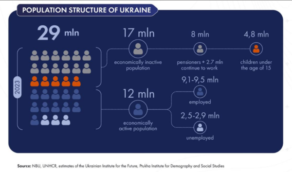 우크라 미래연구소(UIF)의 지난 5월 인구통계 발표에 따르면, 현재 인구는 2900만 명으로 이 가운데 경제활동인구는 1200만 명에 불과하고, 이 중 250만~290만 명이 실업 상태다. 전쟁 전 인구 3760만 명 중 해외로 도피한 2000만 명 중 1200만 명만 귀국했다. 국내 실향민도 500만 명이다. 전선에 내보낼 병사만 부족한 게 아니다. 이문영 서울대 통일평화연구소 교수는 지난달 26일 유튜브 삼프로 강연에서 볼로디미르 파니오토 KIIS 소장의 말을 인용해 "최악의 경우 우크라는 인구의 절반을 잃게 된다. 영토냐, 사람이냐의 딜레마에 빠져 있다"고 말했다.