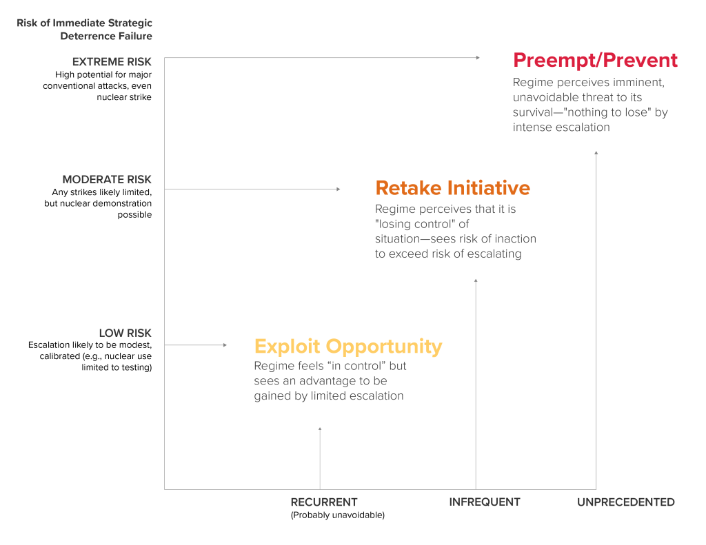 3) “Preempt/prevent”—North Korea perceives that an external threat of potential regime-ending scope is unavoidable and/or imminent, so escalates intensely and preemptively or preventively (high risk tolerance, “nothing to lose”)