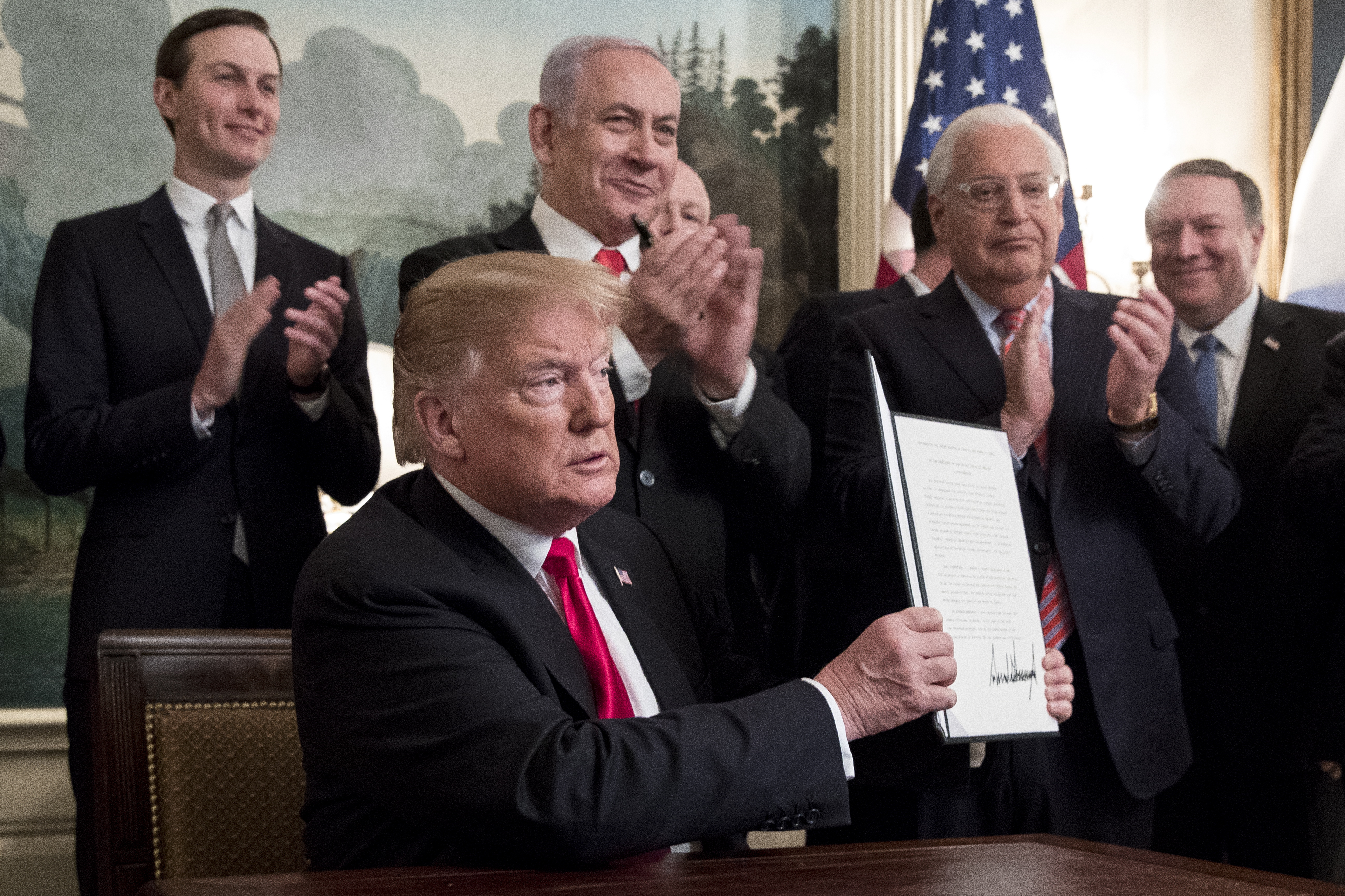 트럼프는 지난 25일 이스라엘이 1967년 중동전 이후 불법 강점하고 있는 골란고원은 이스라엘 영토라고 확인하는 포고령을 발표했다. 이스라엘 총선을 불과 보름 앞두고 워싱턴을 방문한 네타냐후와 자신의 유대인 사위이자 중동정책의 설계자인 재러드 쿠슈너 백악관 선임고문이 나란히 지켜보는 가운데 집무실 책상에서 서명을 했다. “우리는 말보다 더 중요한 행동으로 반유대주의라는 독(poison)에 맞설 것”이라고도 강조했다. 누가 봐도 총선을 앞둔 네타냐후를 지원하기 위한 간접유세였다. 유럽연합(EU)을 필두로 세계는 트럼프의 돌출 행동에 또 한번 경악했다. 골란고원과 요르단강 서안, 동예루살렘 등 이스라엘의 점령지는 중동 문제 해결의 열쇠였다. 지난 수십년 동안 겉돌고 있을지언정 이스라엘이 점령지를 내놓고 그 대신 중동평화를 조성하자는, 영토와 평화의 맞교환(Land for Peace) 원칙은 국제사회가 품어온 희망의 끈이기도 했다. 시리아의 부자(父子) 대통령 바샤르는 대를 이어 이스라엘을 상대로 골란고원의 반환을 요구해왔다.